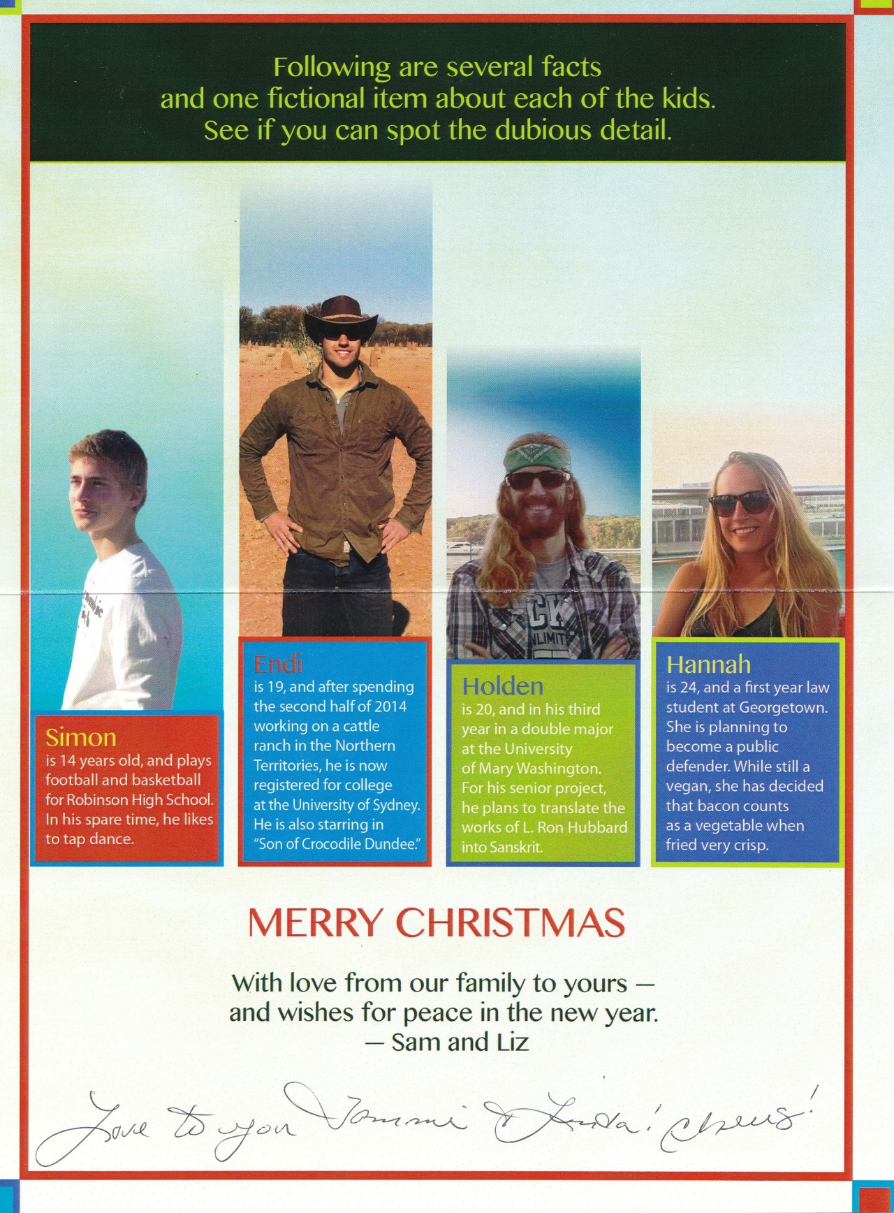 My love goes out now not just to you and my memories of you, but always and forever, your father, my brother, Sam, Liz, your brothers, Holden and Simon and your sister, Hannah.